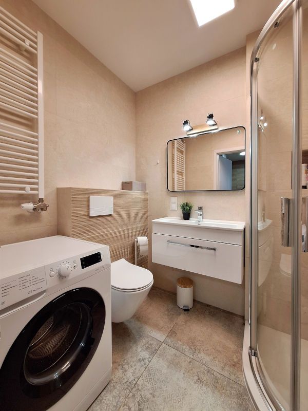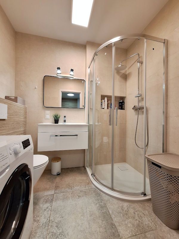 W łazience: prysznic, umywalka, toaleta oraz pralka.