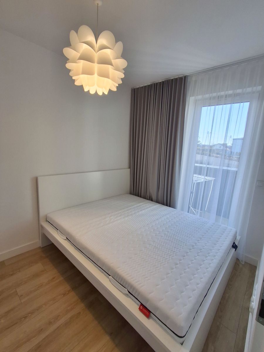 W sypialni znajduje się duża, pojemna szafa i wygodne, dwuosobowe łóżko z materacem .